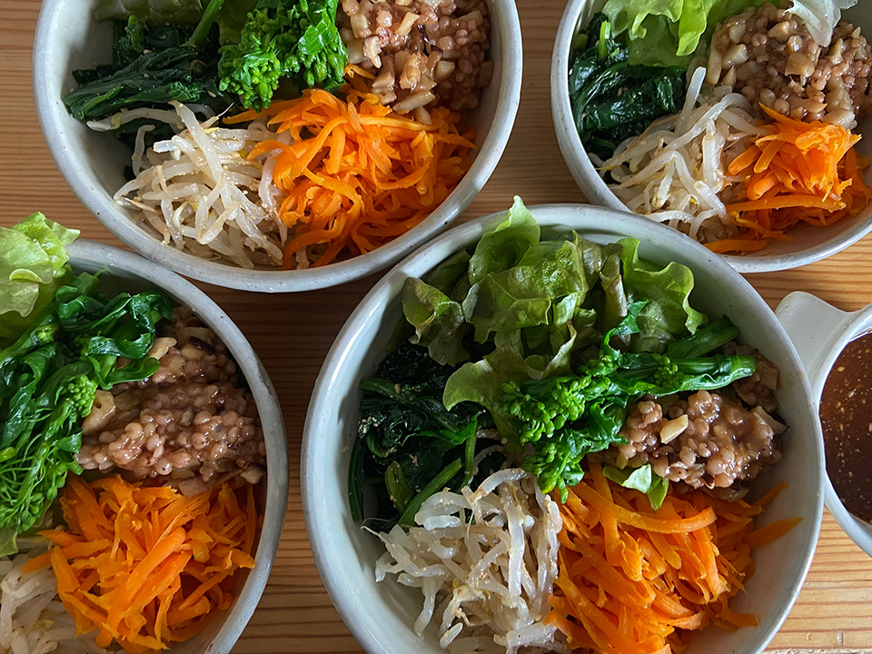 タレに使うコチュジャンは体を温め食欲を促してくれるので、夏バテにもなりやすいこれからの季節にぴったり。すりごまや甘酒でコクが出て、野菜がメインのビビンバでもしっかりと満足感のある味わいに仕上がります。