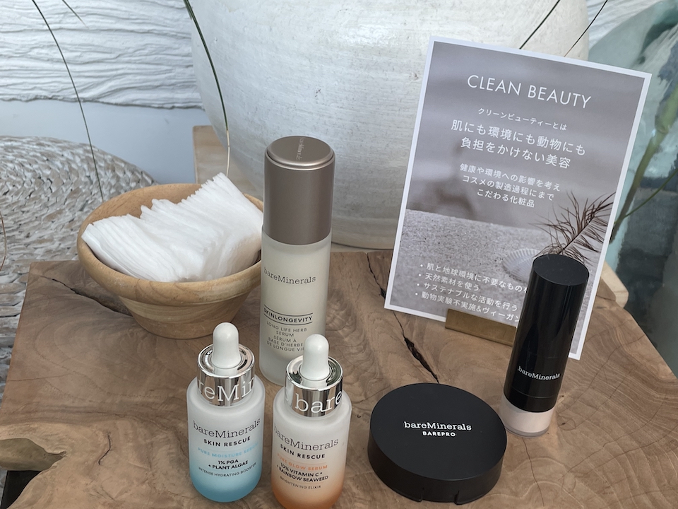 ベアミネラルさんから、クリーンビューティーな美容液やクリアバッグなどの特典つき!お風呂上がりに使用して、お肌ももっちり。