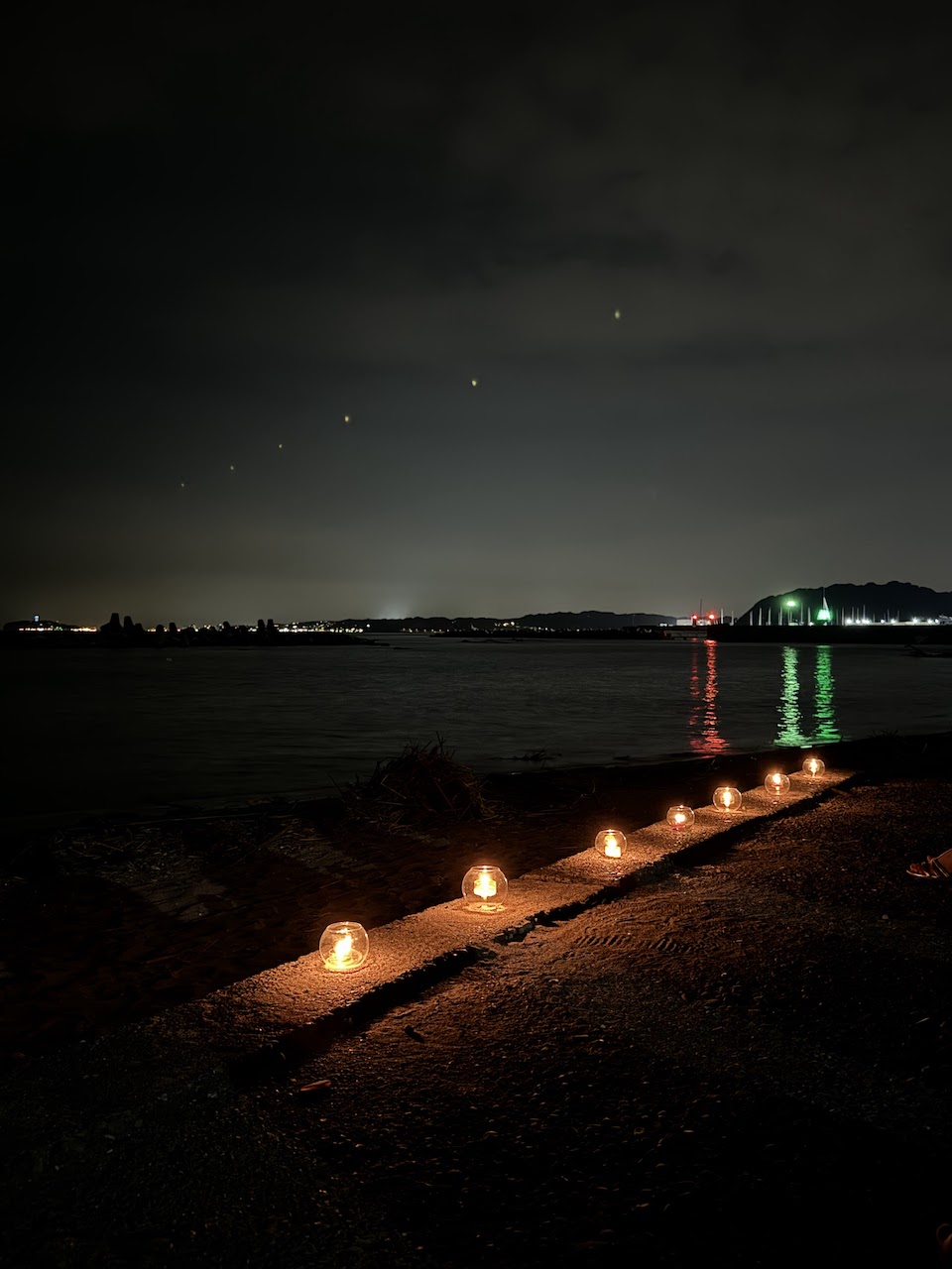 海辺は真っ暗。そこにキャンドルの炎がゆらめきます。