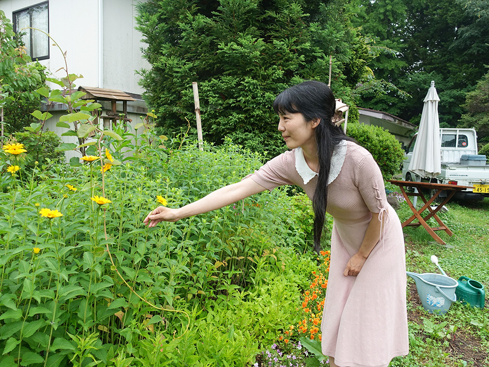 東京で暮らしていた時からベランダ菜園やハーブを育てていた小林さん。人の背丈ほどもある宿根草のヘリオプシスとモナルダが庭に彩りを添える