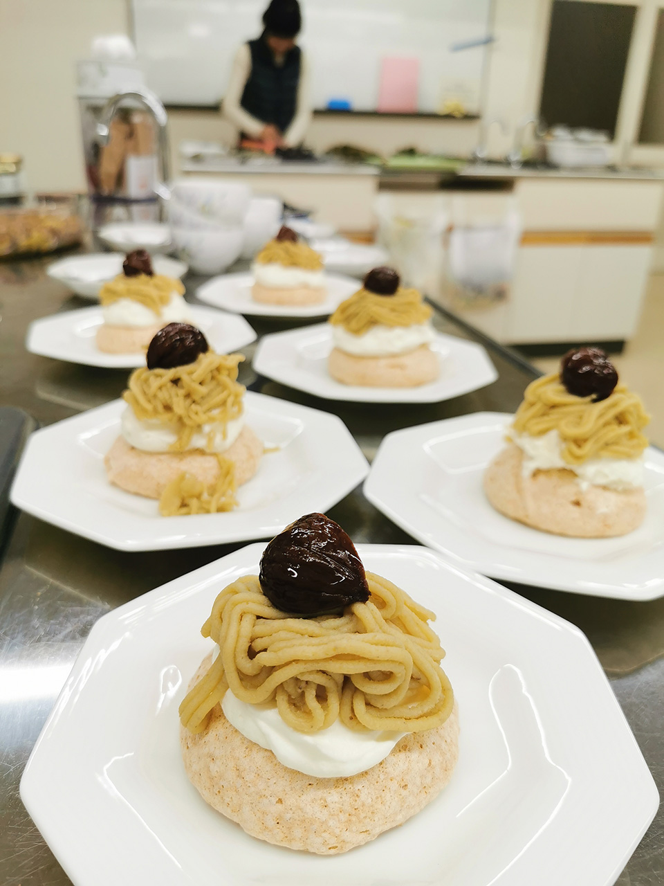 地元で採れた栗を使ったモンブラン。ひとりでは難易度の高いお菓子も、仲間といっしょにおしゃべりしながらあっという間に完成!