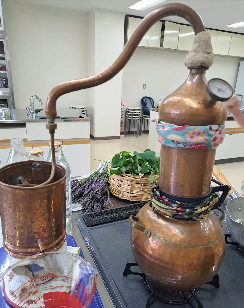 ポルトガル製の伝統的銅製の蒸留器『アランビック』による「ドクダミの蒸留会。ギフトエコノミーの世界に目覚めてから、滅多に出番がないものも、家に飾っておくだけでなく『オカネイラズ』のワークショップなどで積極的に使っていこうと考えている