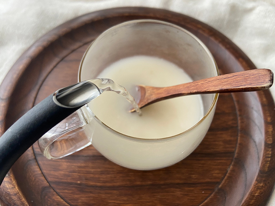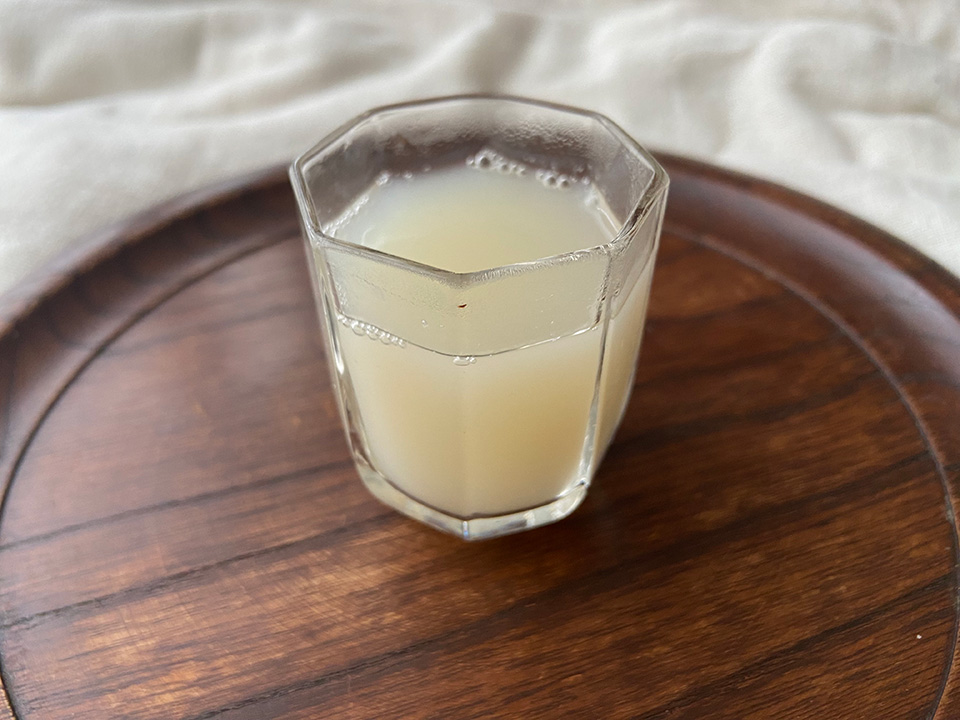 レンコンをすりおろす時に出た水分と、はちみつを一緒にお湯で割って作るので、レンコンもちを作るついでに作るのがオススメです。