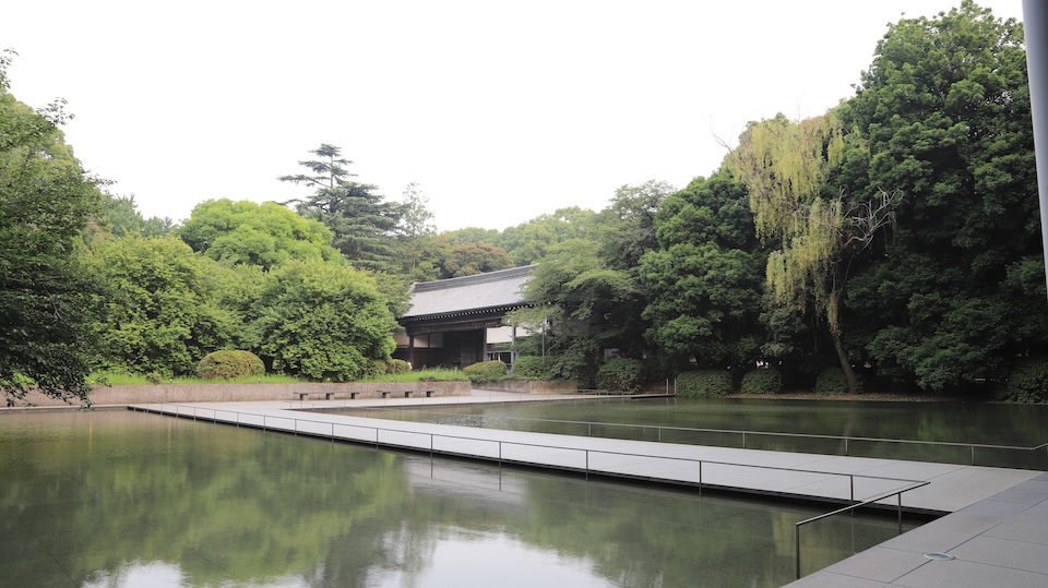 水が浅く張られた水盤が広がり、その向こうに門構えのモダンな佇まいで建つ宝物館。建築を手がけたのは、ニューヨーク近代美術館(MoMA)の増改築やGINZA SIX、鈴木大拙館などを設計したことでも有名な谷口吉生氏です。(ちなみに、68年に開館した東洋館の方は吉生氏の父親である谷口吉郎の設計によるものであり、宝物館は東洋館との意匠的な繋がりも意識されてデザインされています。)谷口氏はこの設計をするにあたり、瓦屋根や障子を使わずに日本的なものをどう表現するか、そして国の博物館の品格を与えるために、整然とした何かオーダーがある建築を、ということを意識したのだそう。さらには、文化財の保存において温湿度や光による劣化や虫害を防ぐことが最重要であるという一方、貴重な文化財を公開・展示して後世にその価値も伝えなければならないという、2つの相反する使命がありました。そのため、展示室と収蔵庫は石とコンクリートで堅牢に覆い、その反面、外側はガラスを全面にした光溢れる開放的なロビーとして構成されています。そして博物館をより身近に感じてもらえるようにと、谷口氏はこの広い空間を民間主催のパーティーなどで貸し切ることができるようにするという提案もしていました。今回の晩餐会では食事のあと、閉館後のこちらの宝物館を特別に貸し切りで見学できる時間も設けられており、門戸を広く開放したいという谷口氏の想いをまさに受け取るかのように、伝統を感じつつも革新的な体験ができる場が設けられたのでした。