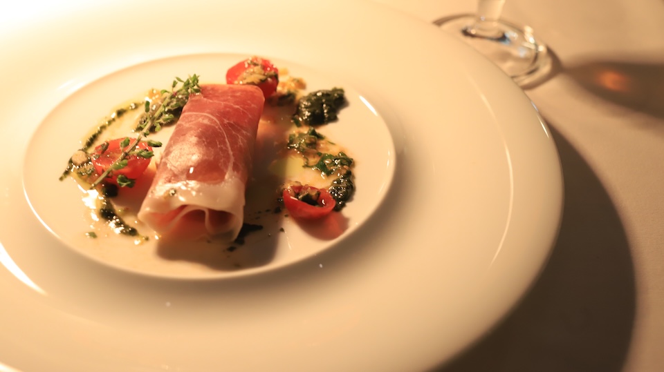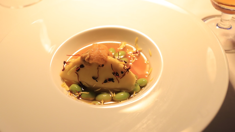 ウェルカムドリンクのマスターズドリームからスタートしたコース料理は全部で4品。まずはビールと相性抜群の枝豆を使った夏らしい前菜を楽しみ、鮎を包んだ生ハム、トリュフ添えの和牛を使ったラグーソースのフリッジとメインに舌鼓をうちます。