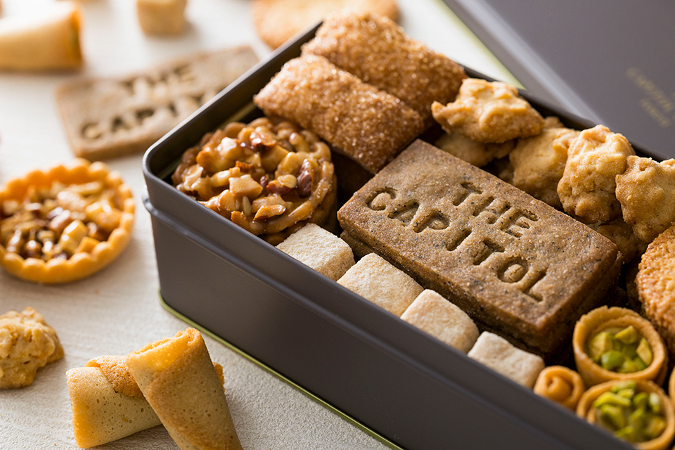 大好評のクッキー缶を15周年特別バージョンで用意。厳選したバターやナッツ、チョコレートなどの素材を生かし、風味や食感にこだわって焼き上げ、ひとつひとつ丁寧に仕立ている。
