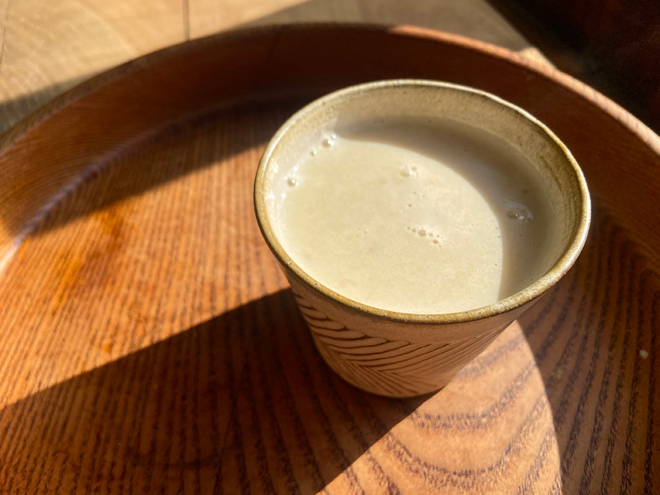 ①小鍋に無調整豆乳、甘酒、生姜を入れて、混ぜながら弱火で沸騰しないようにゆっくり温め、カップに移す。
