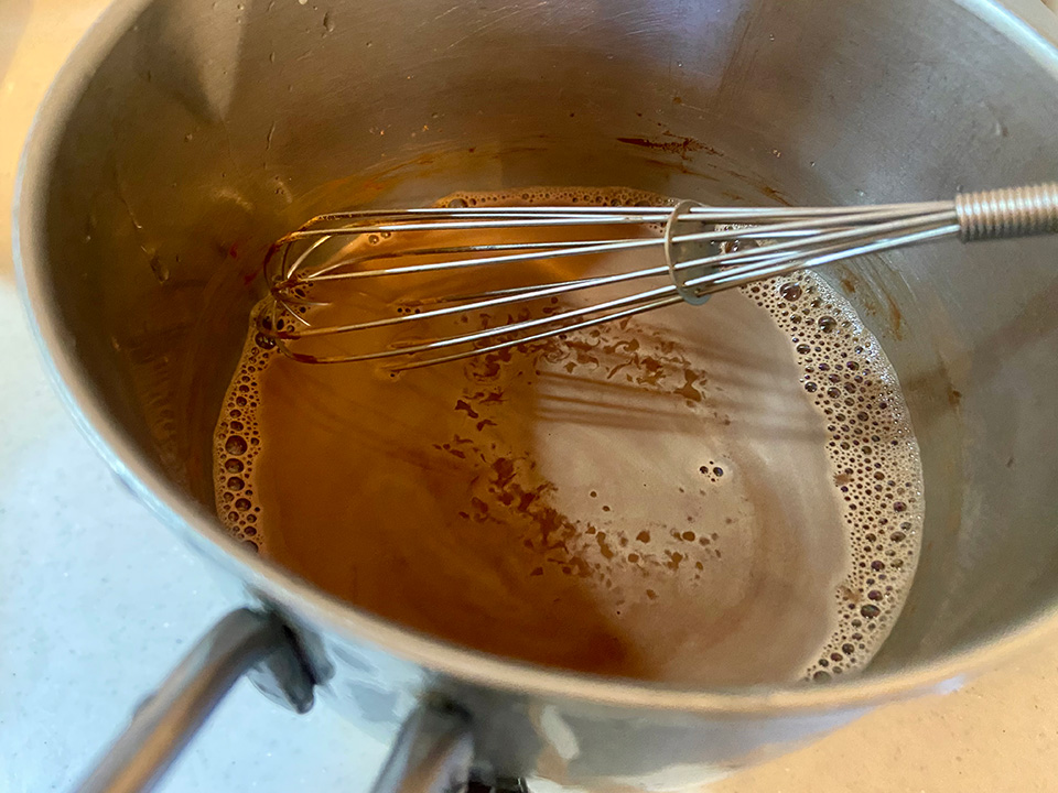 ②粉が溶けたら植物性ミルク、甘酒を入れて、混ぜながら弱火で沸騰しないように温める。