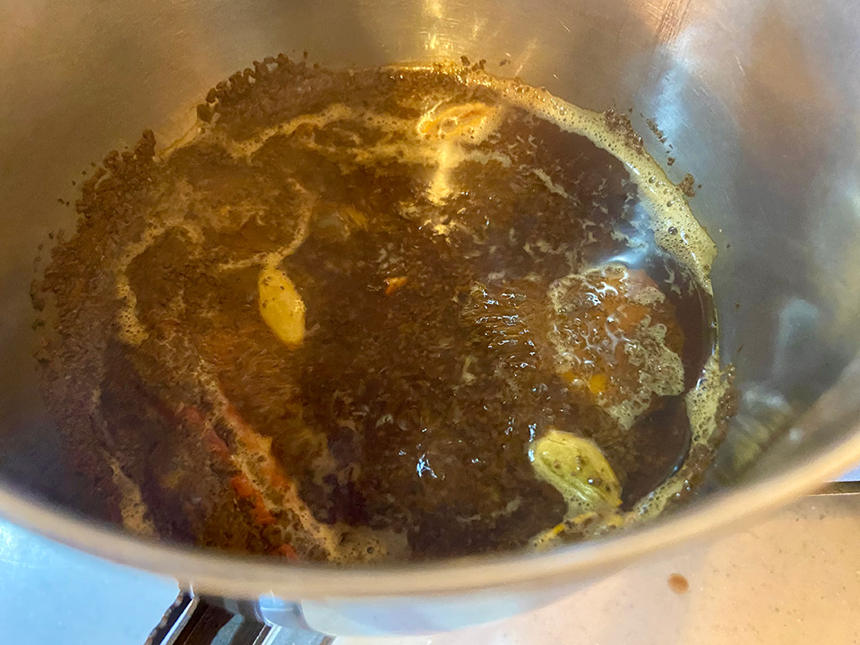 ①お鍋に水、シナモンスティック、潰したカルダモン、生姜スライス、紅茶を入れて火にかけ、沸騰したら弱火で2分ほど煮出す