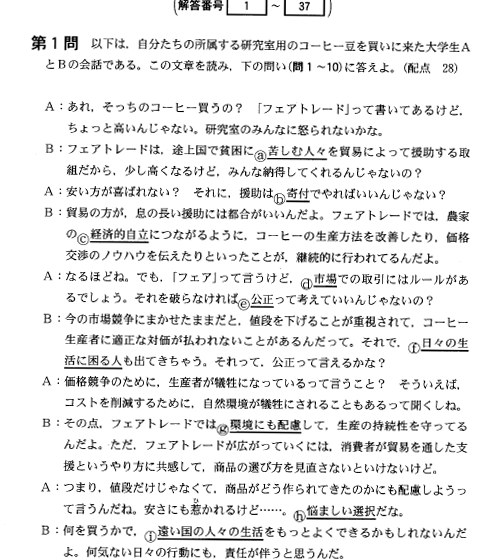 Blog 【 2014/1/31 】 ethicalista センター試験でフェアトレードの問題が出ました センター試験でフェアトレードの問題が出ました やはり時代は良い方向に変わって来ています!! 頼もしいです。うれしいです! 二日目の大学入試センター試験で、「倫理」の問題の第1問目にフェアトレードが取り上げられました。 大学生二人がフェアトレード・コーヒーの意味について会話をしている様子が設問文になっているようなのですが、その会話自体、フェアトレードの本質を伝える素晴らしい会話です。フェアトレードのことがとてもよくわかります。 教育の現場で子ども達に...